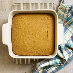 Bake as instructed in a square baking dish. You can use either an 8x8 or 9x9-inch square pan, or an 8" or 9" round cake pan. Obviously your cornbread will be a little deeper in the 8x8/8" dish. Double the recipe for a 9X13-inch pan. Be sure to grease your pan well, since this cornbread doesn't have a lot of fat in it to prevent sticking.